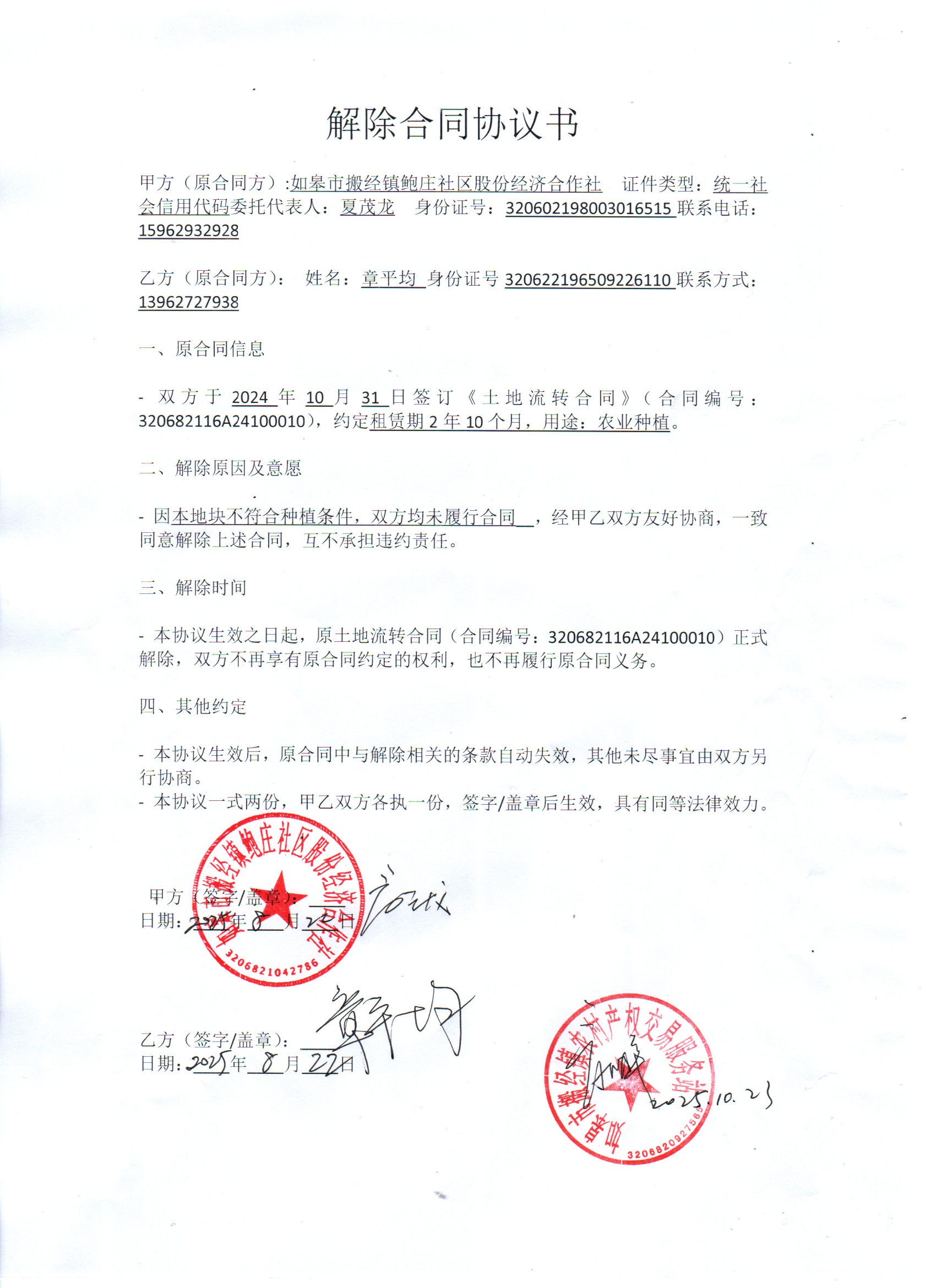 项目320682116A24100010解除合同情况说明
